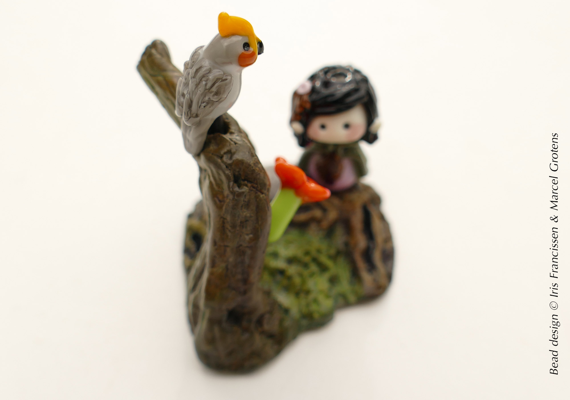 Forest Elf of the Australian Jungle with orange Flower and Cockatiel (Nymphicus hollandicus) on a Jungle display base. We made this set for a customer. The bird, flower and Elf are made of glass. The Elf is a glass bead that can be removed from the base. The base is made of epoxy clay and painted with acrylic paints. It has a satin varnish.