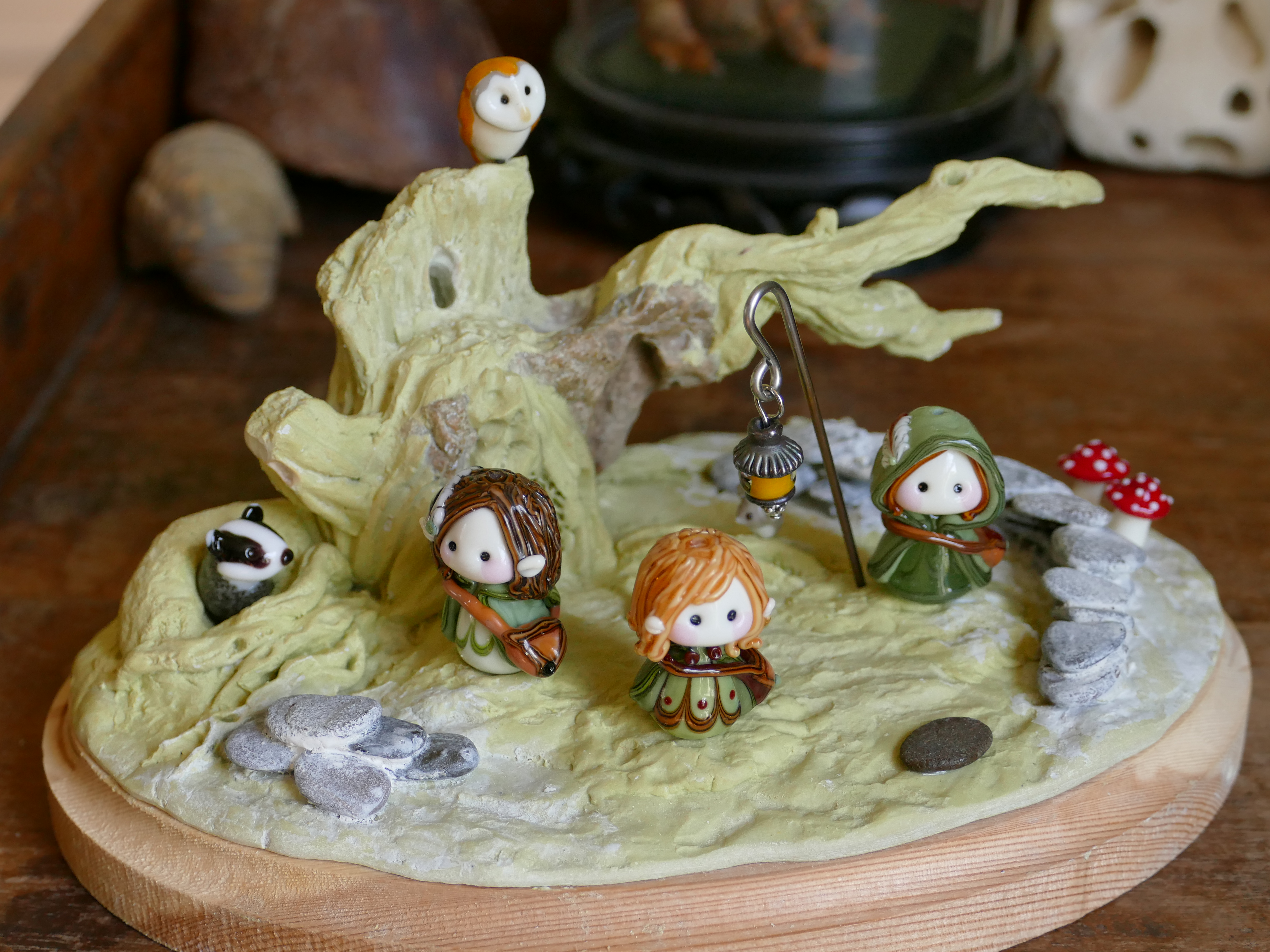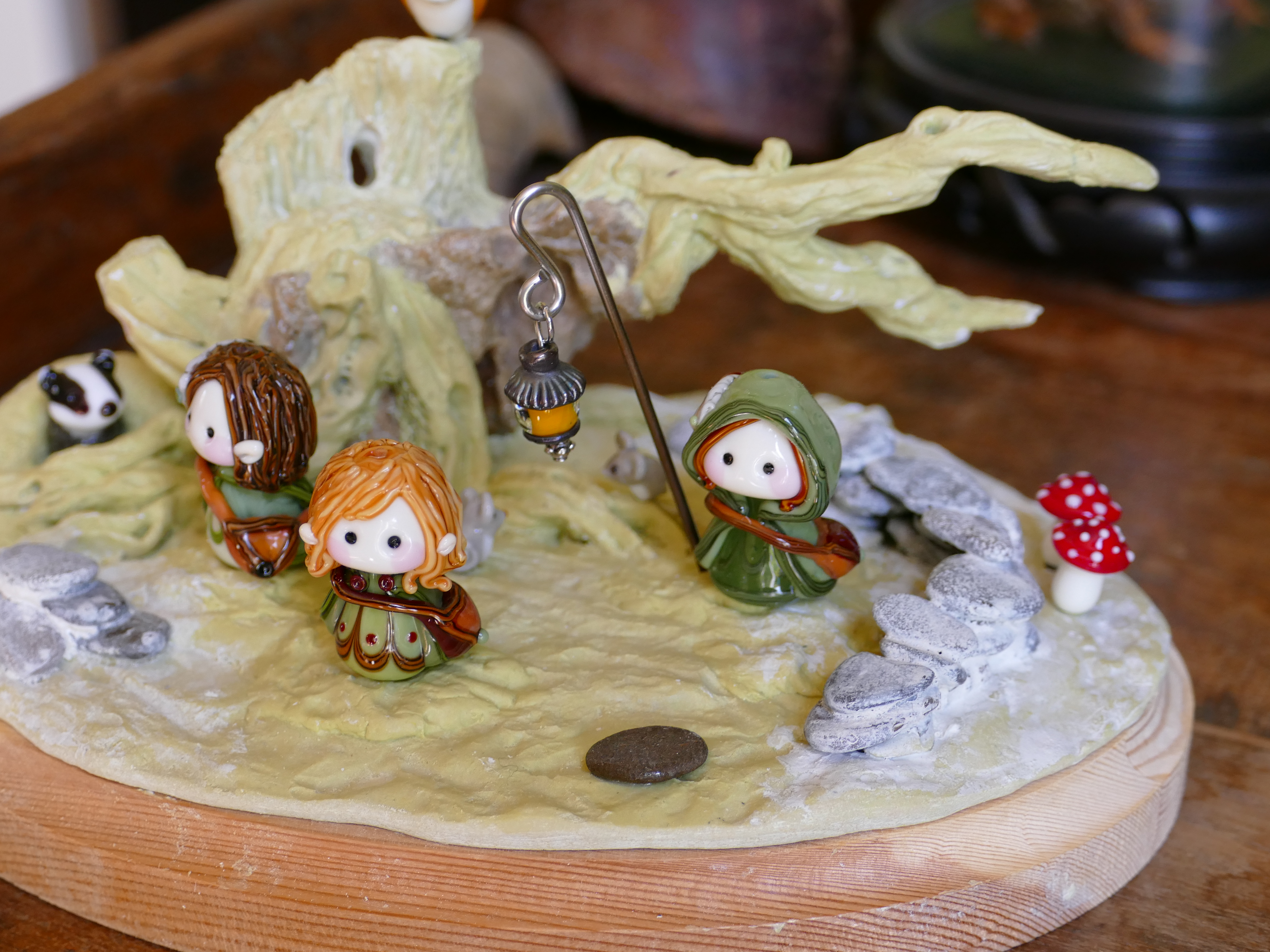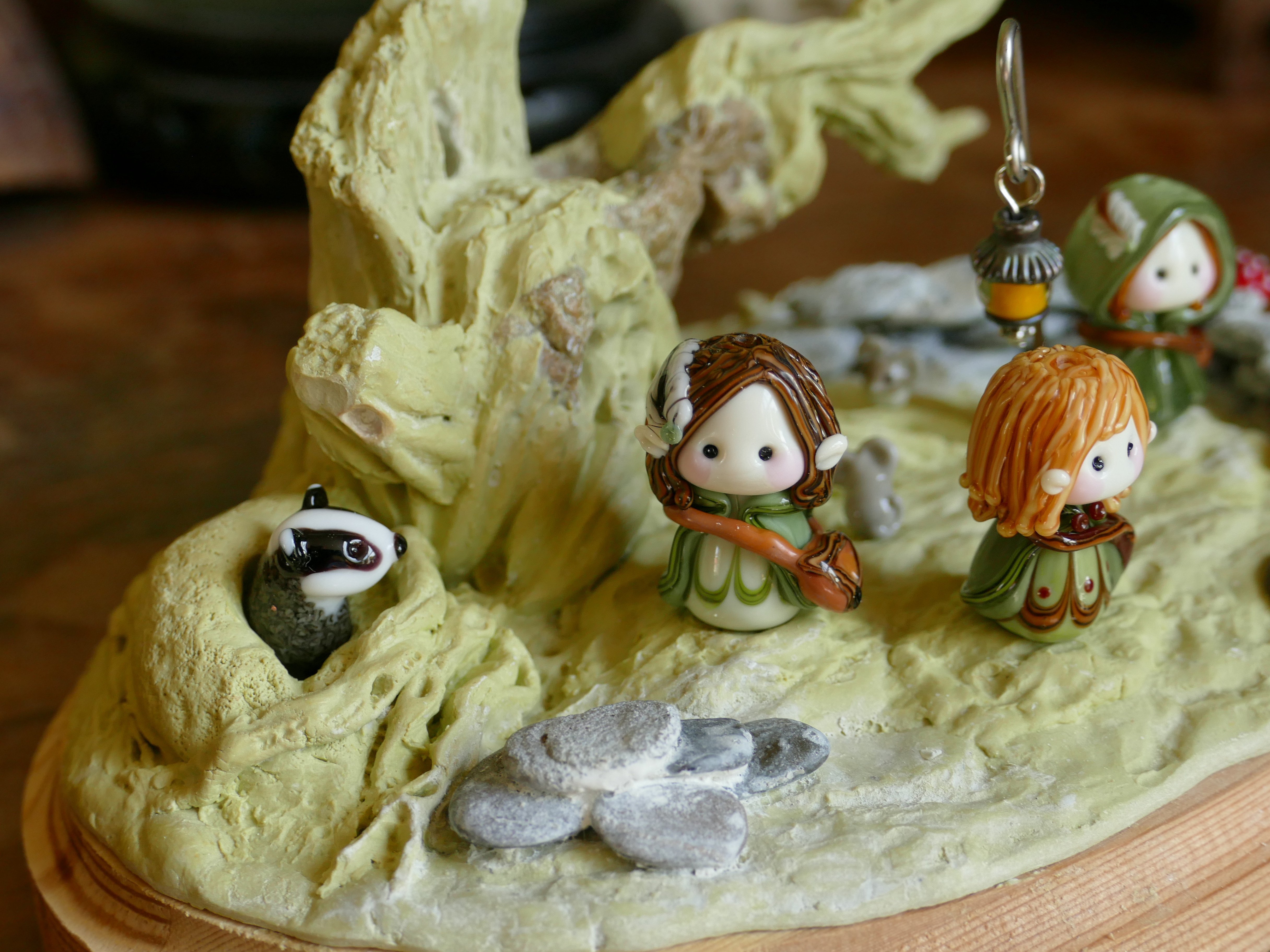 Busy finishing a special, one time only, glass beads display set. The set includes three Glass Bead Elves and a Lantern, which can be taken from the base. Fixed to the display are a Barn Owl, a European Badger, two Mice and two Fly Agarics.