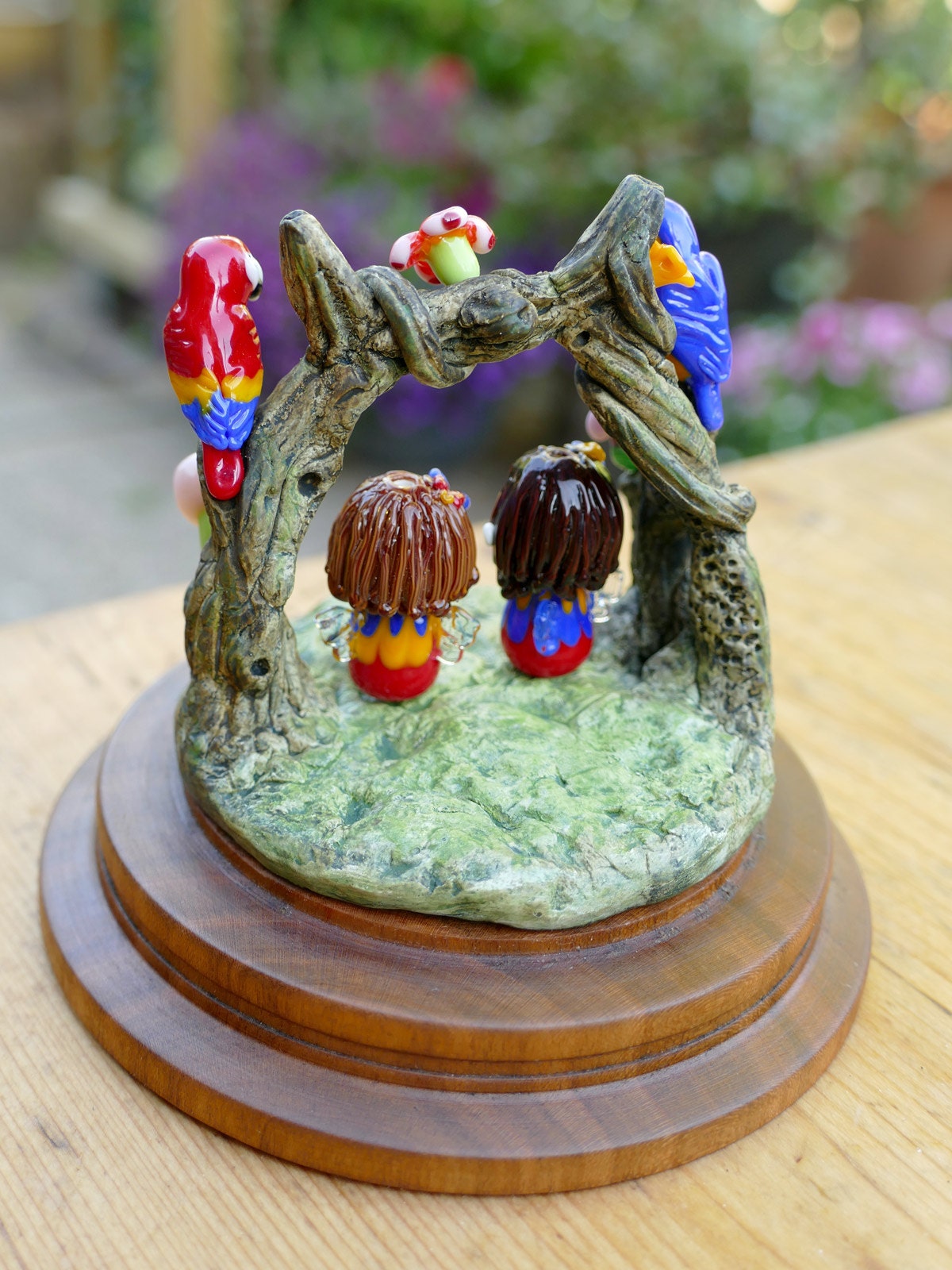 In honour of a lost dear friend of one of our customers daughter. It was special but also challenging to make. Iris made the glasswork, I sculpted the base. The wooden base was made by a friend from the wood of a tree that fell during a storm. The whole set can be placed under a small glass dome (not pictured).